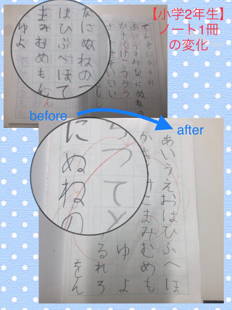 さて、今回は教室展示作品と、昨年5月から習ってくれてる小学2年生の男の子のノート一冊のbefore afterです。