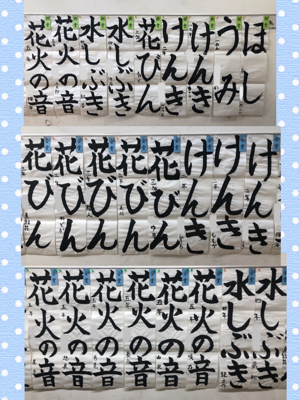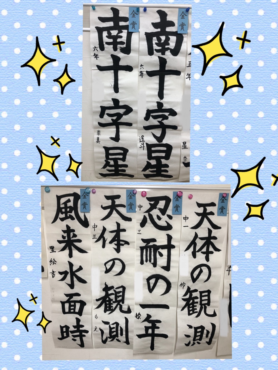 先週、七夕展の一次審査が返ってきました。金賞、銀賞の作品を教室に展示しています。