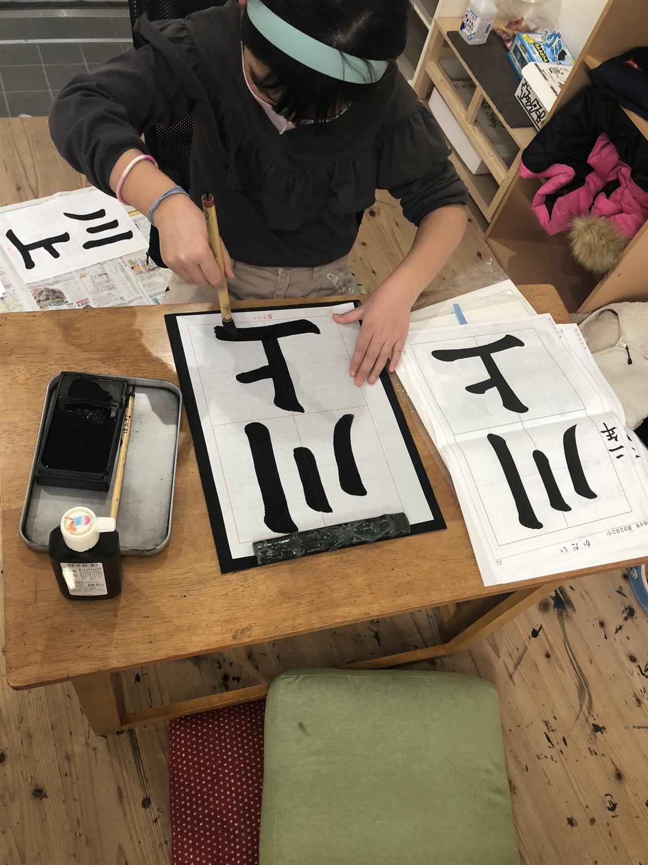 写真は2年生のHちゃん。始筆の打ち込みを意識して、しっかり力強い線を引けています。