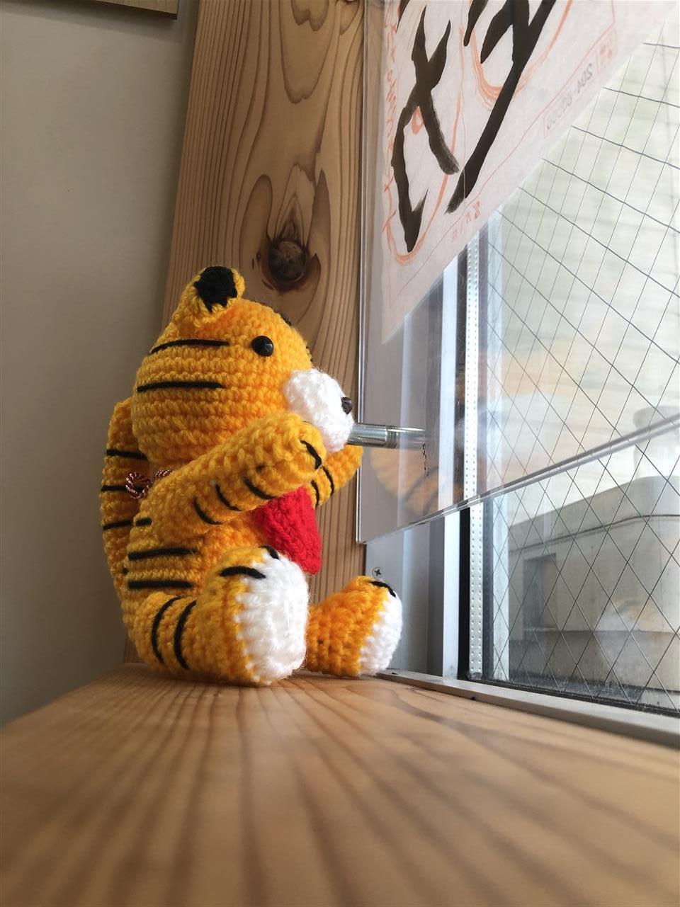 写真は母のお友達が手作りした虎の編みぐるみ。教室の窓に置いて、招き猫になってもらってます♪