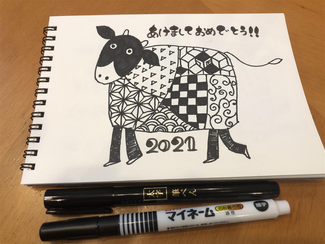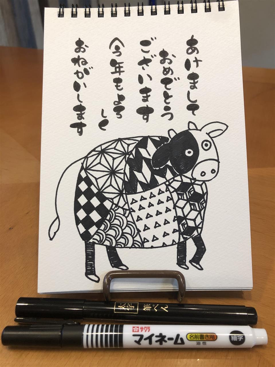 ちょうど小学生向けの講座があったので、そこで面白い年賀状を教えてもらったので早速皆さんにも教えたい!ということで。来年の干支、牛さんを描くとともに今流行りの鬼滅の刃の和柄をたくさん入れて、なんとも可愛い構図になりました。