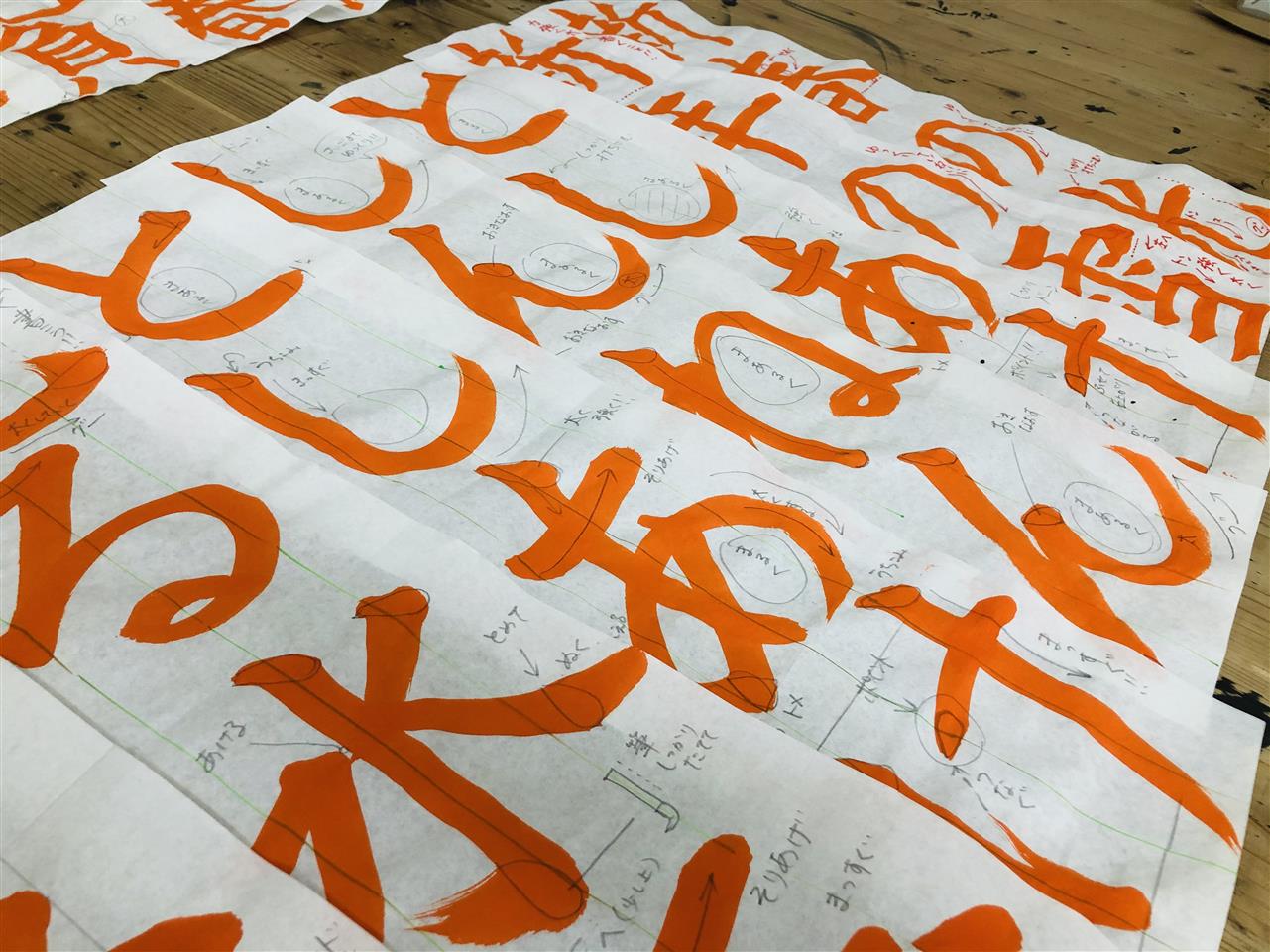 半切という大きなサイズの作品を書く時、通常は中腰の姿勢で書きます。もちろん、一枚や二枚練習したところで納得のいく作品など仕上がりませんので、何十枚、何時間と書きます。先日も気づけば6時間経っていました。中腰で書けなくなってくると、四つ這いになります。