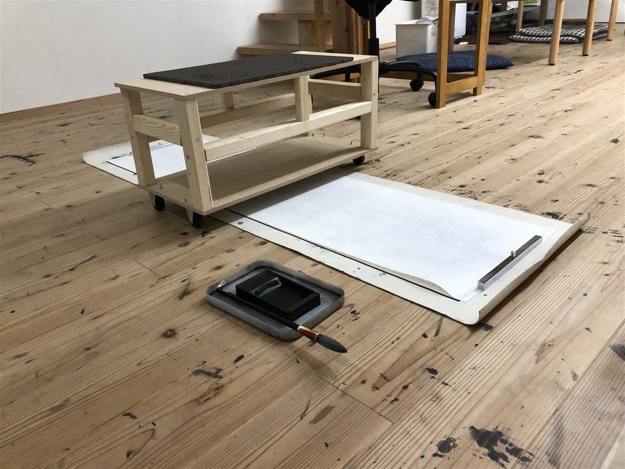 足には車輪が付いていて、書きながら後ろに下がっていけます!座面にはクッション材を付けてくれる心遣い。