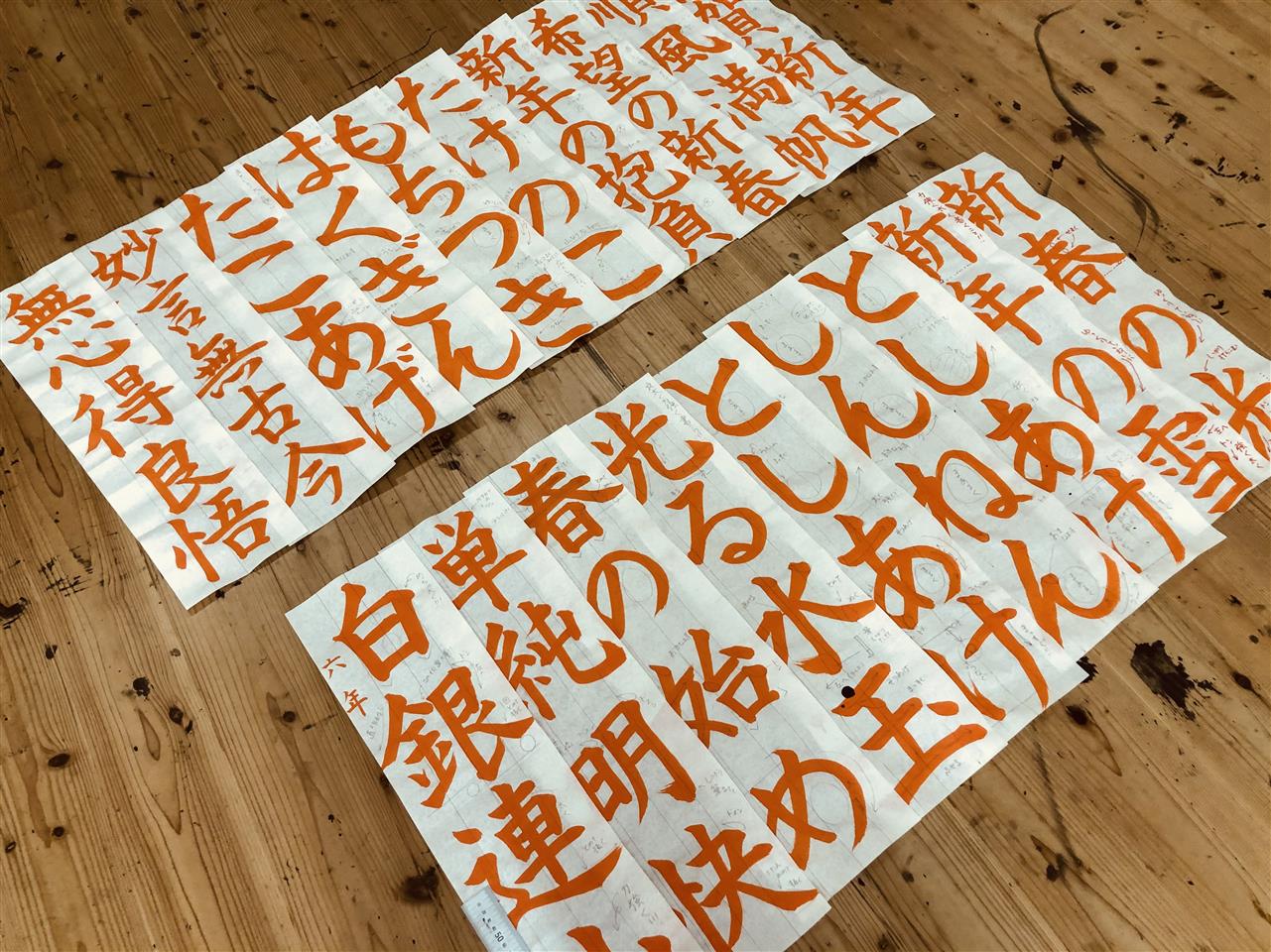 本日は書初め展に向けて、みんなが書く八つ切りのお手本を作りました。一人一人の顔を思い浮かべて、みんなが1つでも上の賞を獲れるように、一枚一枚にポイントを書き込みました。
